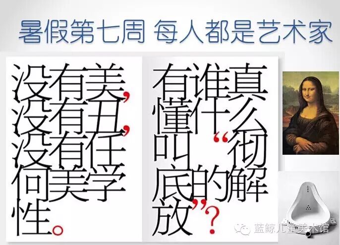 这个漫长的暑假,我们将带孩子们走进美术馆,同时也期望继而他们以后能够带动爸爸,妈妈,爷爷,奶奶,姥姥,姥爷等都走进美术馆,一起体会人在艺术面前的自由——是没有人能限制你看到的,对这个艺术品你怎么看,一定是我这么看,你这么看,一定是每个人对它的理解不一样。