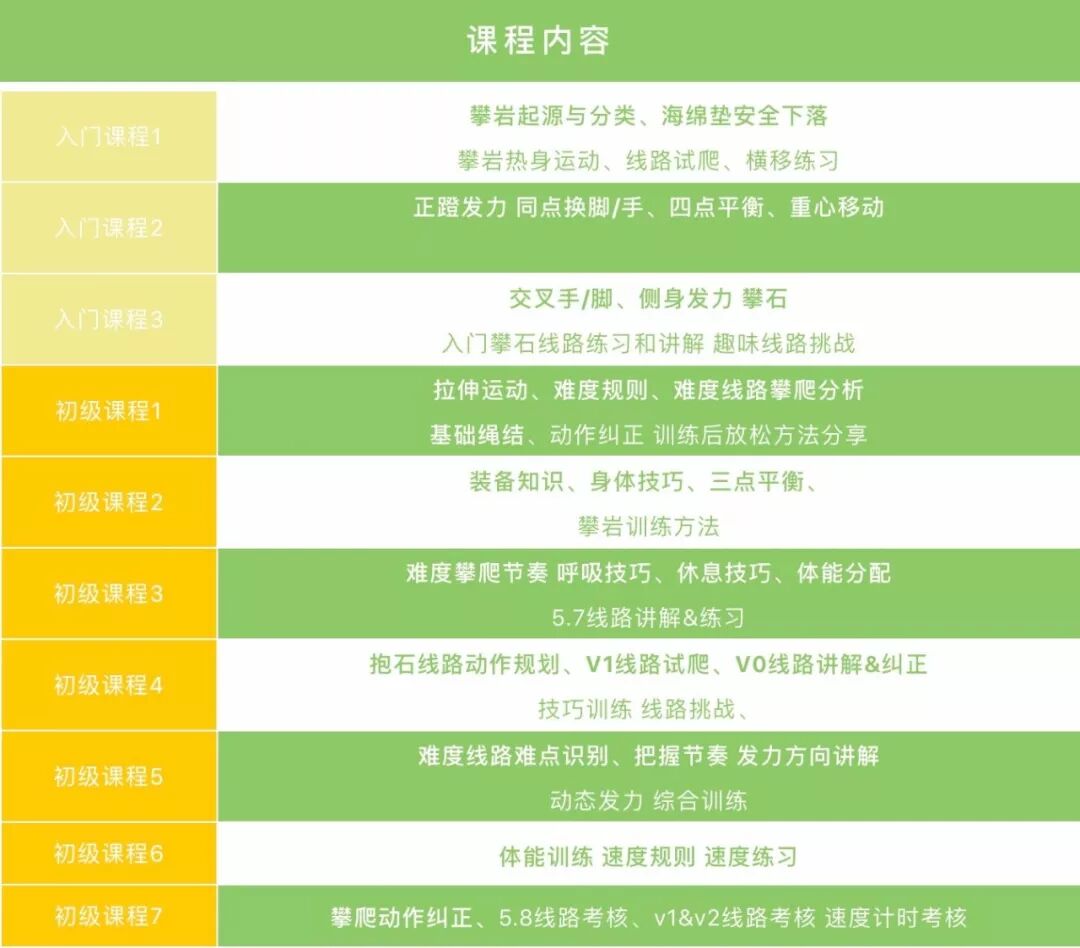 A:初级班课程目标是带领学员了解并学习基础攀岩技术,对攀岩运动有科学的认识。